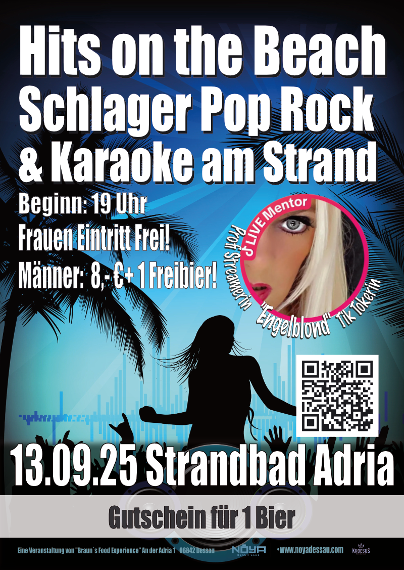 Am 13.09. soll die große Hits on the Beach – Rock, Pop, Schlager & Karaoke Nacht im Strandbad Adria stattfinden – nach dem bereits erfolgreichen Grand Opening am 09. August.